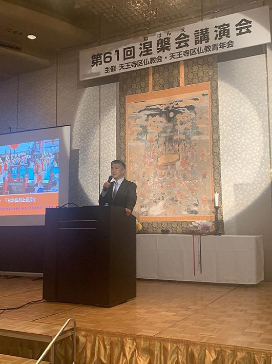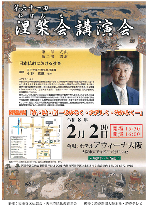 天王寺区仏教会主催・第61回涅槃会講演会に協賛──「日本仏教における雅楽」をテーマに小野真龍氏が講演 2026.02.02 ニュース 2026年2月2日(月)、天王寺区仏教会ならびに天王寺区仏教青年会の主催による第61回涅槃会講演会がホテルアウィーナ大阪にて開催され、本年も当協会は協賛させていただき、式典へもご招待いただきました。 本講演会は、釈尊の入滅を偲ぶ涅槃会の意義を現代に伝えるとともに、仏教文化の理解を深める場として長年継続されているものであり、地域における宗教文化活動の中核的な役割を担っています。当日も多くの来場者が集い、厳かな雰囲気の中で第一部の式典が執り行われました。 続く第二部の講演では、小野真龍先生(天王寺楽所雅亮会理事長)が「日本仏教における雅楽」と題して登壇されました。講演では、仏教伝来に伴って大陸よりもたらされた雅楽・舞楽が、日本の宗教儀礼や宮廷文化の中でどのように受容・変容し、今日に至るまで継承されてきたかについて、歴史的背景と文化的文脈を踏まえながら体系的に解説されました。 とりわけ、音楽や舞といった身体的表現が仏教儀礼と結びつくことで、教義の伝達や場の荘厳性をいかに支えてきたのかという視点は、来場者にとって新たな理解を促すものであり、終始高い関心をもって聴講されていました。講演後には多くの来場者から好意的な反応が寄せられ、本講演会の意義を改めて実感させる機会となりました。